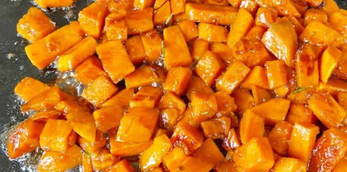 Add fresh rosemary to the candied sweet potatoes and stir to combine. When sauce is reduced (should take about 2 minutes) transfer candied sweet potatoes to a serving dish and serve warm.