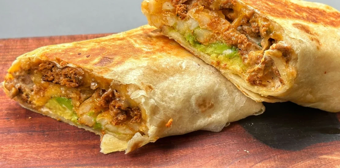 Place shredded queso quesadilla and sharp cheddar cheese in the center of each flour tortilla. Top with some of the chorizo mixture, French fries, avocado slices, and a drizzle of cilantro lime crema. Carefully fold up each tortilla to form a burrito.